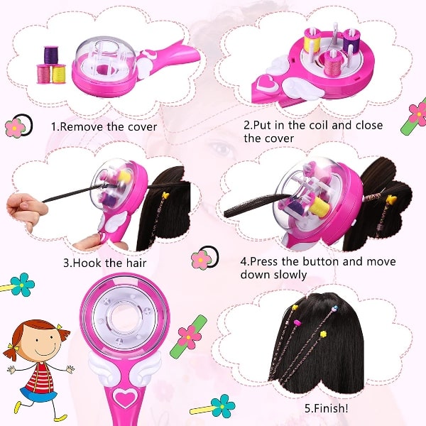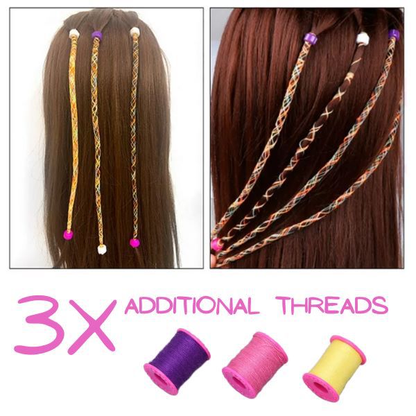 - La confezione contiene: 1x avvolgi-treccine, 12x fermagli per capelli, 3x filo (filo giallo, rosa e viola), 2x accessori per facilitare l’uso.