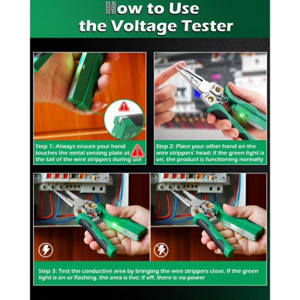 Copre AWG 10, 12, 14, 18 e da 1,0 a 4,0 mm². Il tester integrato ti permette di confermare che un circuito sia isolato prima di toccarlo.