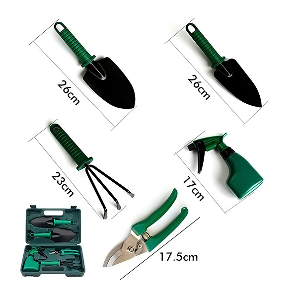 1 x Set di attrezzi da giardino con scatola di custodia: 1 x rastrello per diserbo, 2 x Paletta per giardinaggio, 1 x forbice per potare, 1 x nebulizzatore.