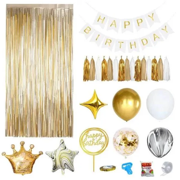 60 palloncini di vari colori; 1x palloncino a forma di corona; 2x palloncini a forma di stella a cinque punte; 2x palloncini a forma di stella a quattro punte; 1x tenda fatta di nastri scintillanti; 1x striscione Happy Birthday; 5x set di nappe decorative colorate; 1x decorazione per torta Happy Birthday; nastro decorativo, accessori per legare i palloncini, adesivo e nastro per fissare i palloncini.