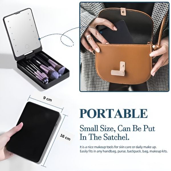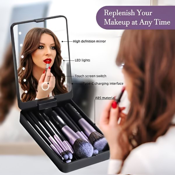 Il set di pennelli e lo specchio a LED si adattano perfettamente alla vostra borsa, in modo da poter ritoccare il trucco con facilità ovunque vi porti la giornata.