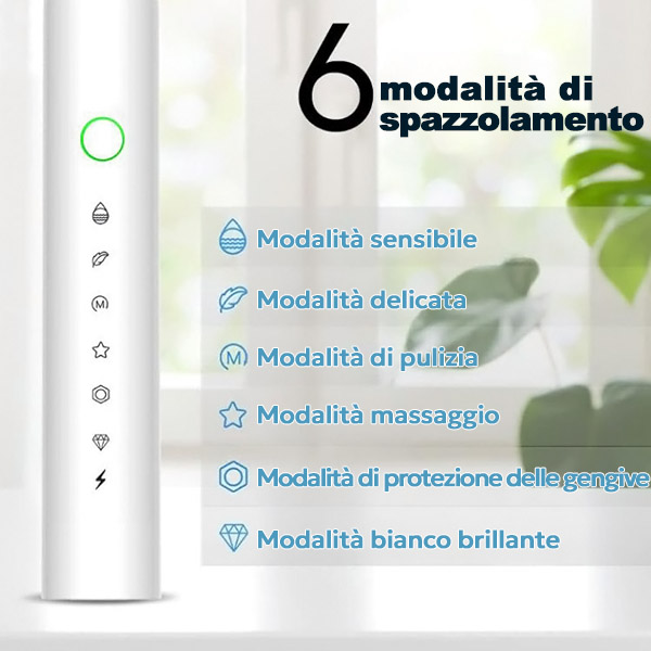 Sia che abbiate denti sensibili o che abbiate bisogno di una pulizia quotidiana, le 6 modalità sono progettate per soddisfare le varie esigenze dentali e garantire un comfort ottimale.
