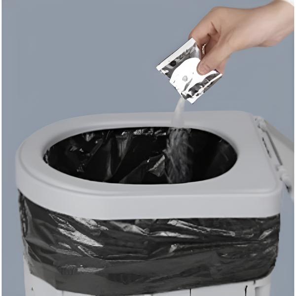 Basta aggiungere la polvere che neutralizza gli odori nella borsa per poter utilizzare la toilette ovunque e in qualsiasi momento.